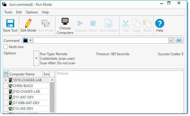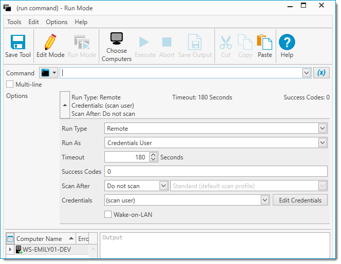 Opens the Run Command window for the selected computer(s) or collection(s). Additionally in Edit Mode, commands can be saved as custom tool. |