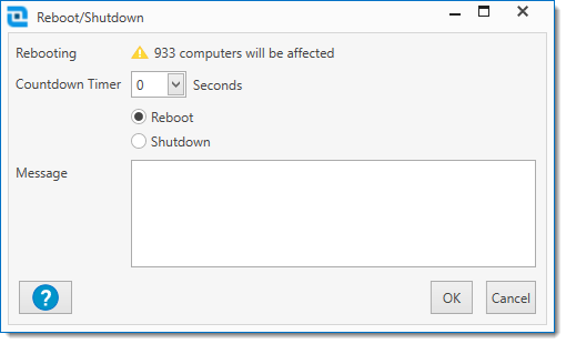 Opens the Reboot/Shutdown window. The Reboot/Shutdown tool and corresponding window allows you to reboot or shutdown one or multiple computers or the computers in one or multiple collections. Once the appropriate settings have been made, click OK to initiate the reboot/shutdown or click Cancel to abort the reboot/shutdown.