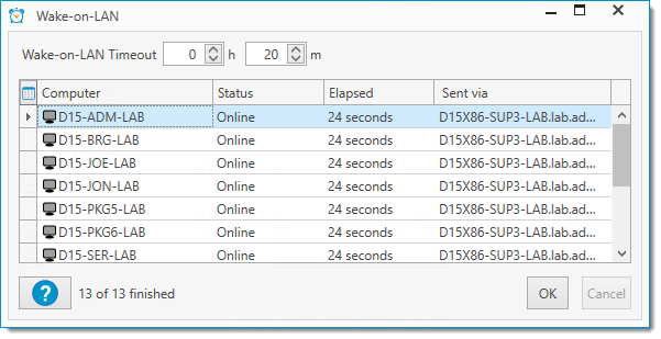 Opens the Wake-on-LAN window and immediately initiates a WOL event on all listed machines. WOL can be initiated on a single computer, many computers, a single collection, or multiple collections. Click Cancel to abort the WOL event(s). Click OK once all machines have successfully been started or WOL can no longer run.